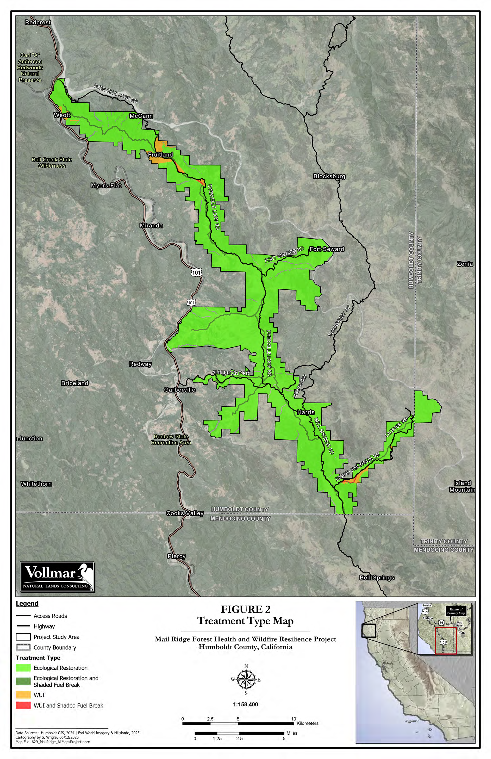 In partnership with the Southern Humboldt Fire Safe Council (SHFSC), California Department of Forestry and Fire Protection (CAL FIRE) Humboldt-Del Norte Unit, and local volunteer fire departments (VFD), HCRCD proposes up to 20,000 acres of vegetation treatments within the approximately 50,000-acre Mail Ridge Forest Health and Wildfire Resilience Project Study Area, implemented at a rate of approximately 2,000 acres annually for 10 years.